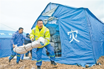 7月20日,甘肃省临夏回族自治州消防、电力、公安、卫生等部门会同当地干部群众以及志愿者对受灾严重的东乡族自治县展开道路清淤、设施抢修、受灾群众安置、隐患排查等工作,并将大批救灾物资运抵受灾地区。图为当日,蓝天救援队队员在东乡族自治县果园镇陈何村搬运救灾物资。