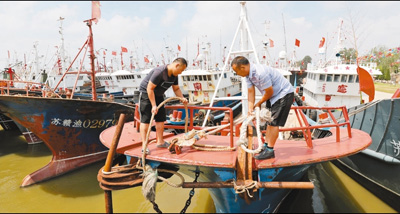 二十二日,江苏连云港市渔民在加固渔船。